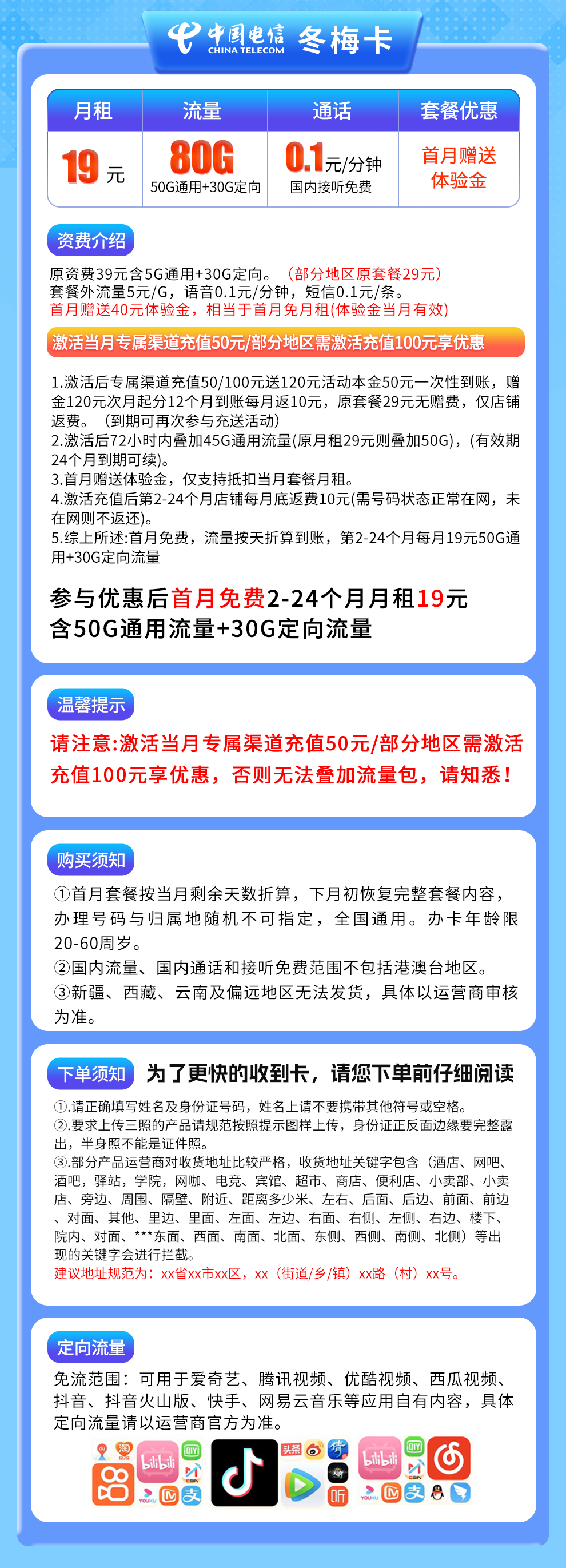 激活当月专属渠道充值50元/部分地区需激活充值100元,方可享受以下优惠:
