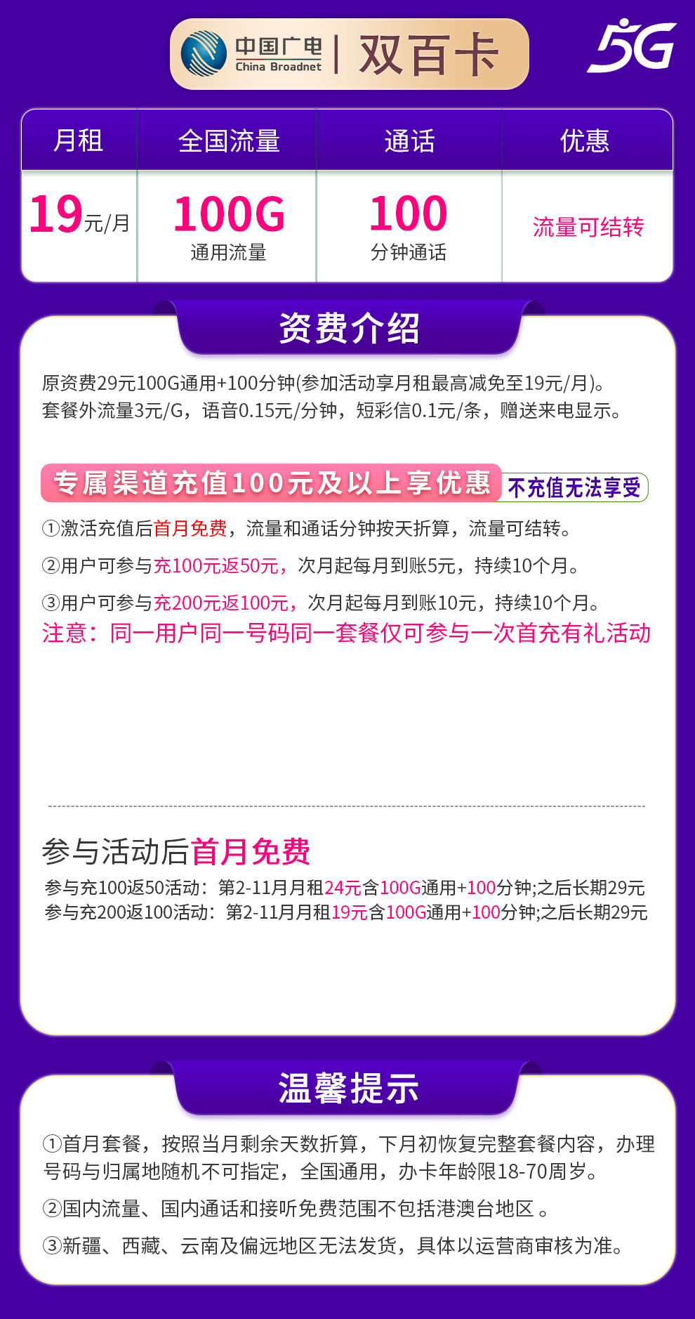 套餐和 流量长期有效到期可续,双百套餐的充送链接是一样的