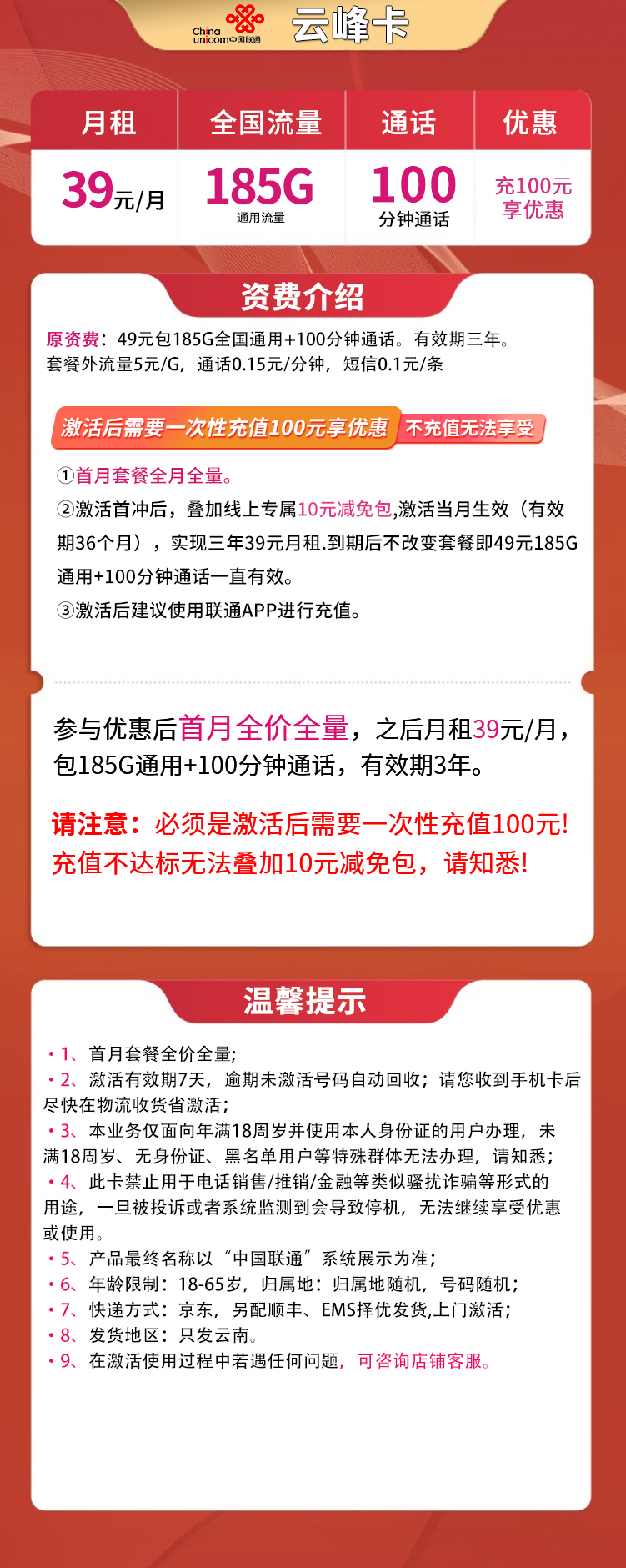 联通云峰卡39元185G通用+100分钟【只发云南】