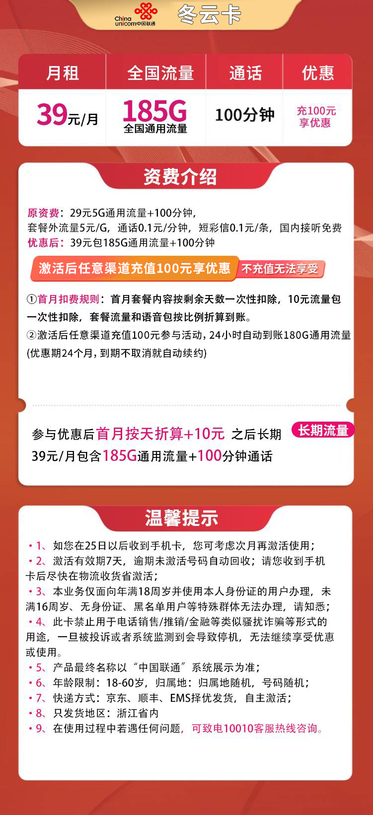 - 长期套餐:39元/月=185G通用流量+100分钟通话