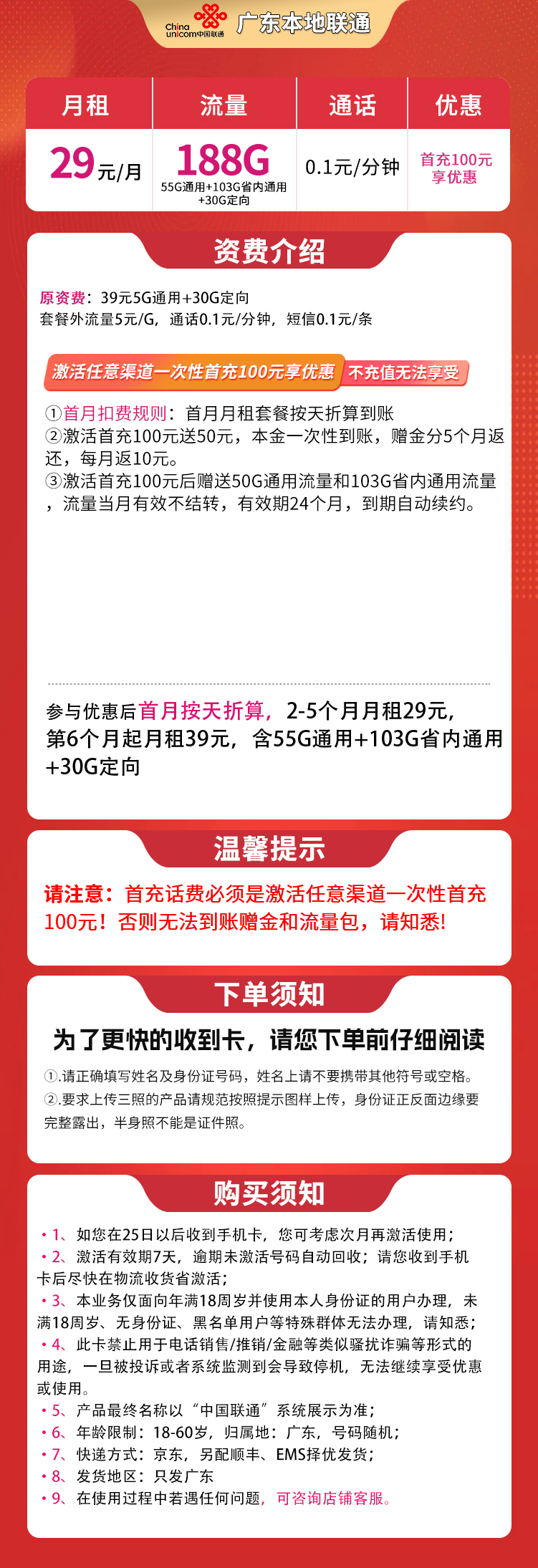 - 首充100元后48小时内送153G流量包(50G全国+103G全国通用),有效期24个月自动续
