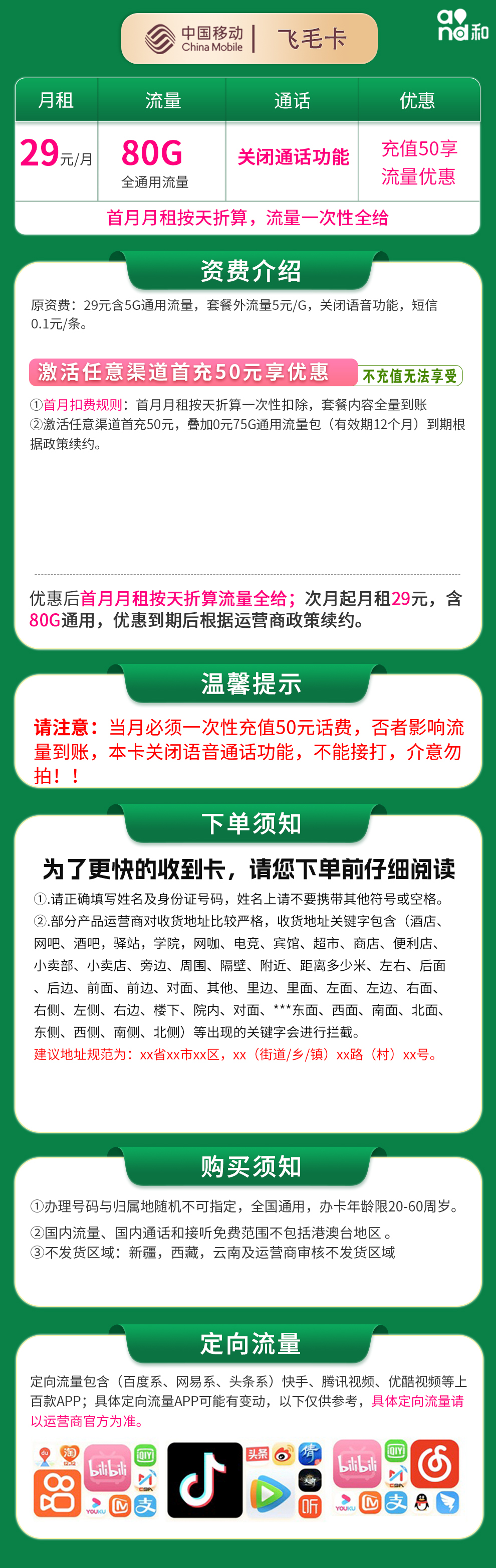2、激活后叠加75G通用流量(有效期12个月),不可结转、不可转赠。