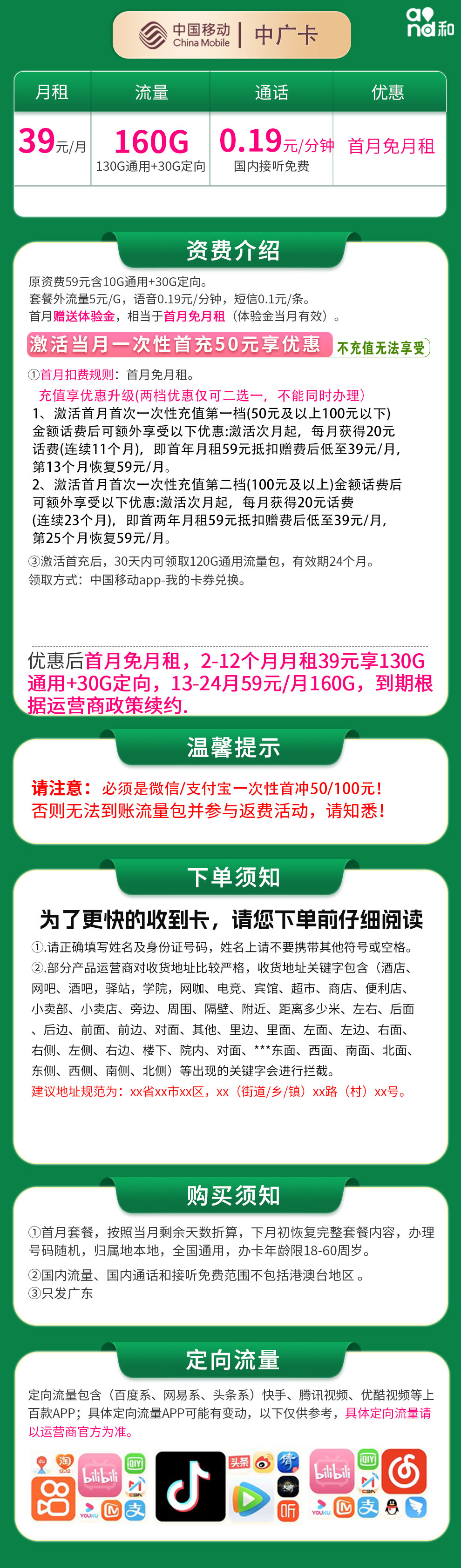 激活当月任意渠道一次性首充50元,方可享受以下优惠: