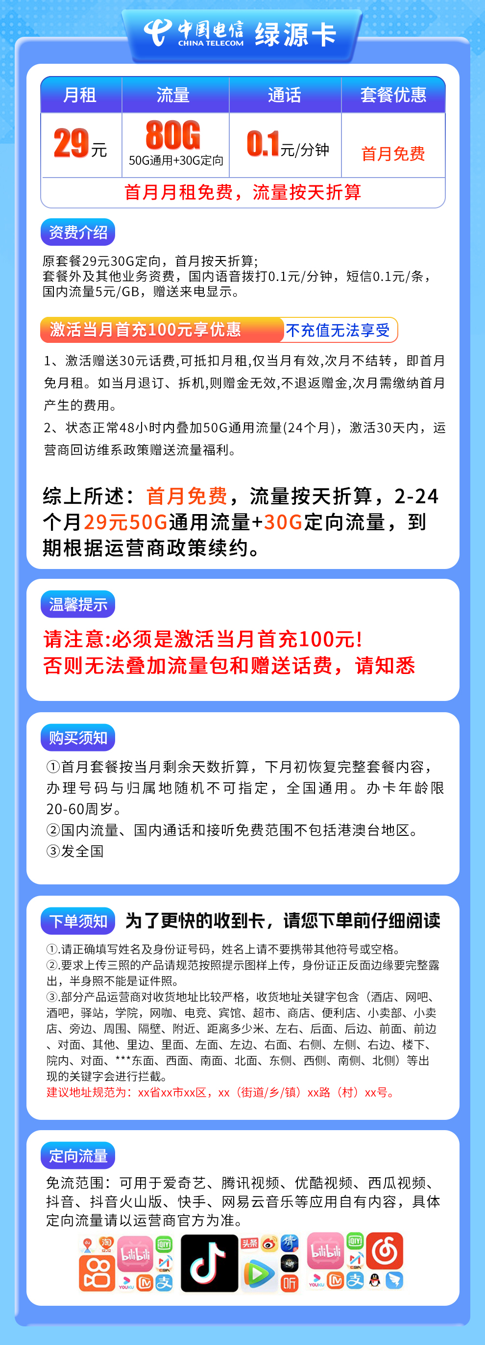 2-24个月29元50G通用流量+30G定向流量,到期根据运营商政策续约。