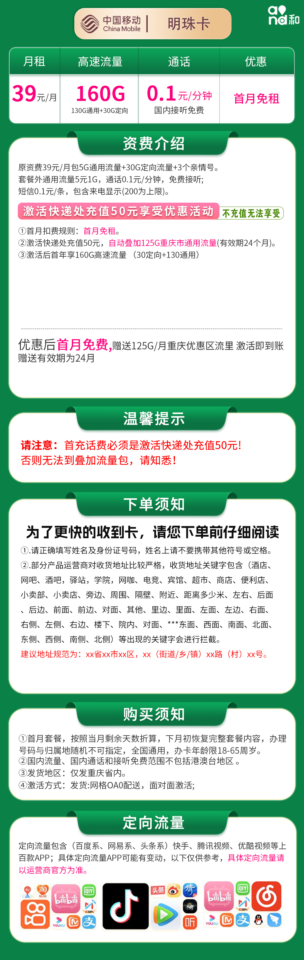 ②激活快递处充值50元,自动叠加125G重庆市通用流量(有效期24个月)。