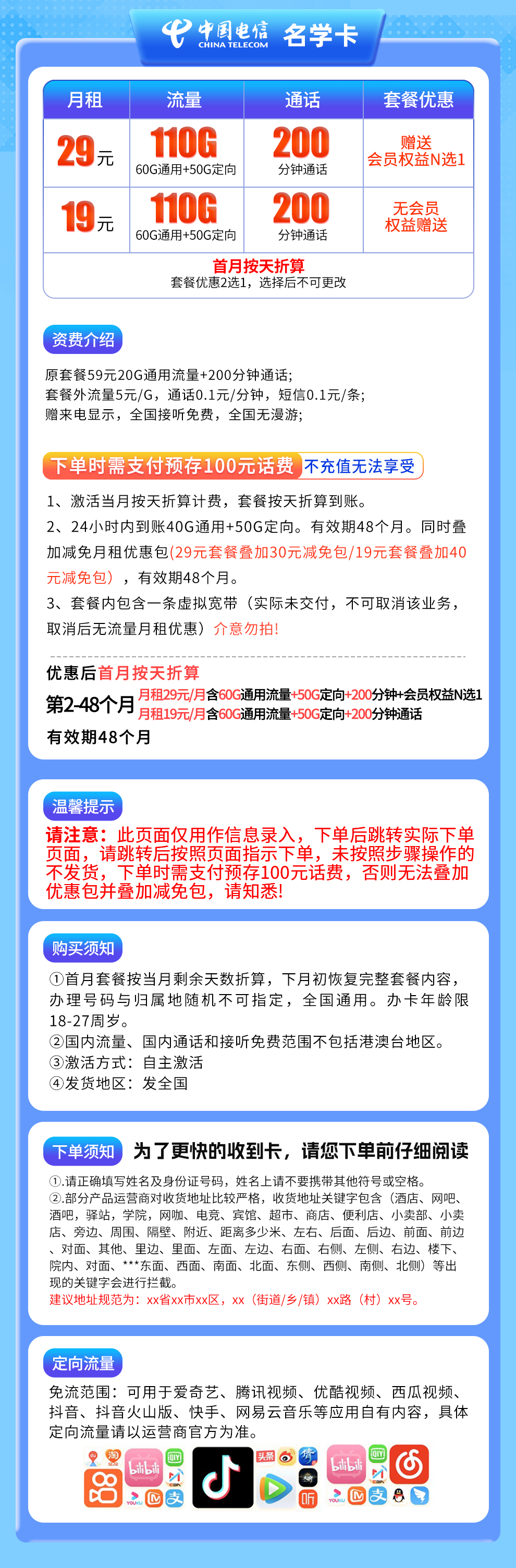 2月-48月:29元60G通用+50G定向+200分钟+会员权益N选1