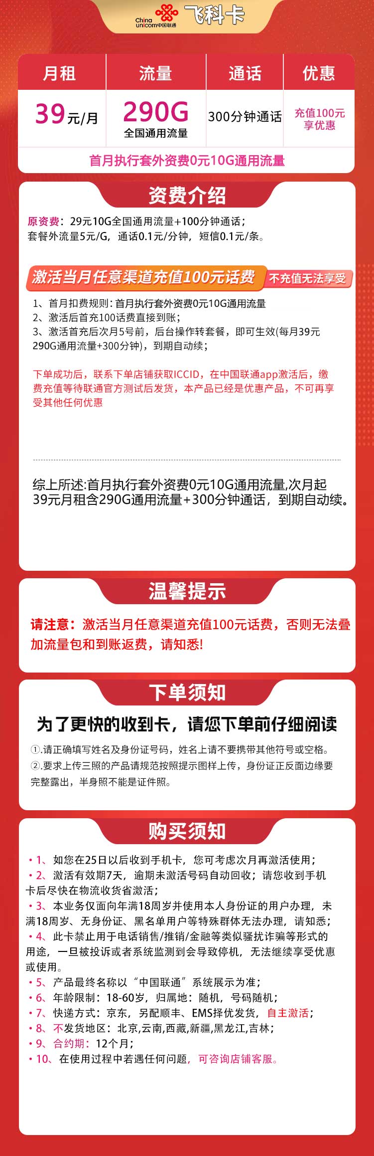 次月起39元/月290G全国通用流量+300分钟通话,到期自动续。