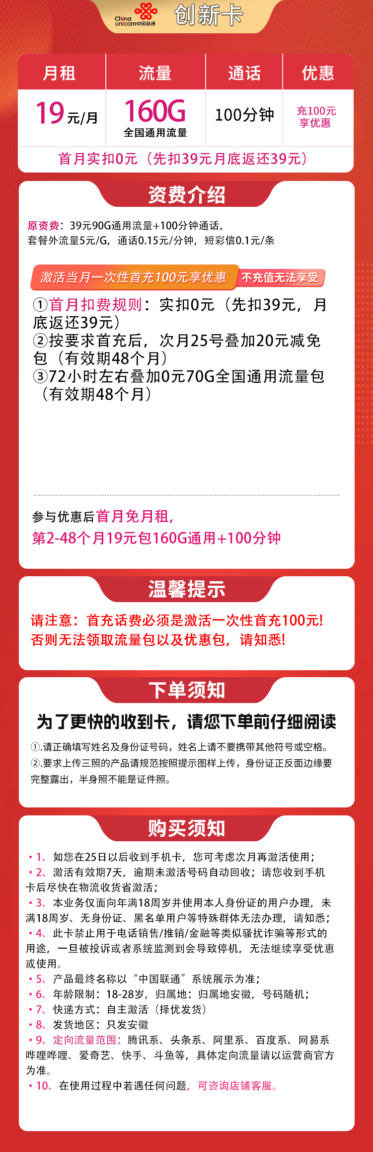 综上所述:首月免月租第2-48个月19元包160G通用+100分钟