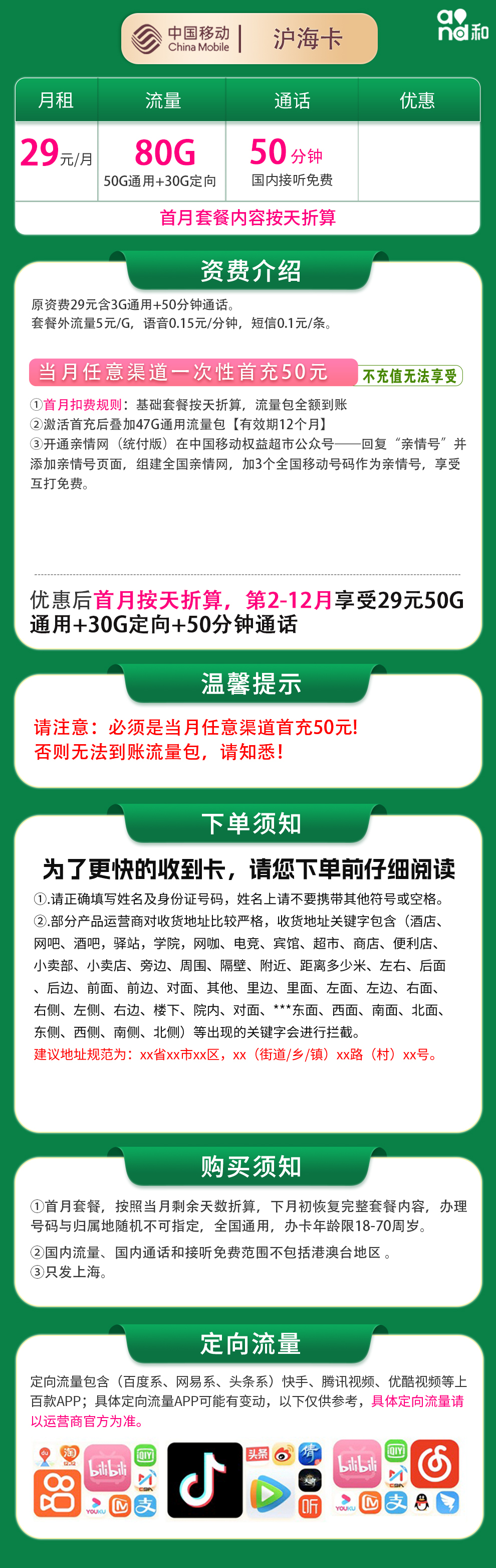 只限上海用户办理,首月需充值50元才能享受优惠:
