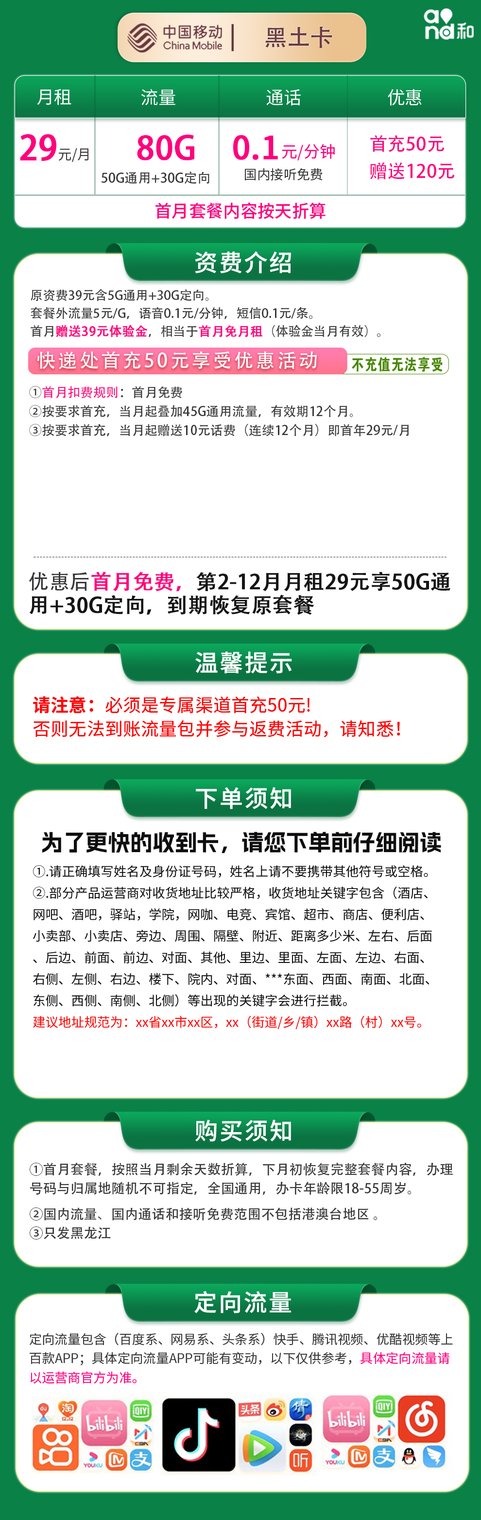移动黑土卡29元套餐(仅限黑龙江):