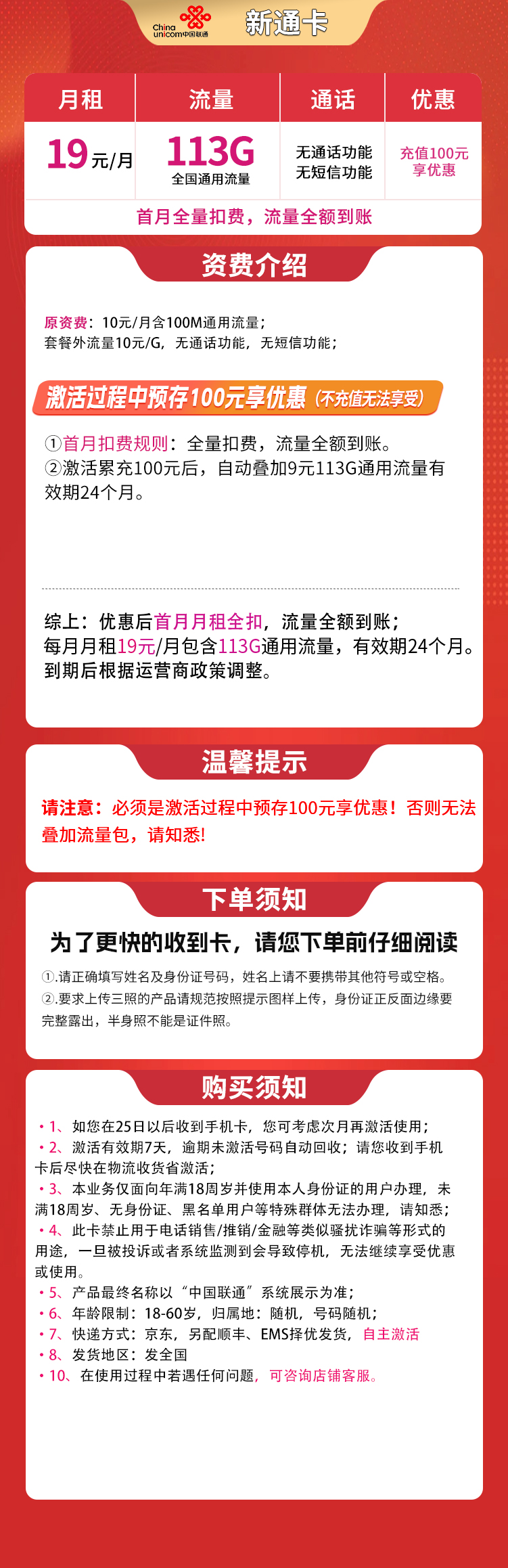 激活过程中预存100元享优惠享受优惠:1.首月全量扣费:19元113G通用流量2.激活充值100元后自动叠加9元113G通用流量包。有效期24个月。综上:第1-24个月 月租19元113G全国通用流量(关闭语音通话功能、关闭短信收发功能)