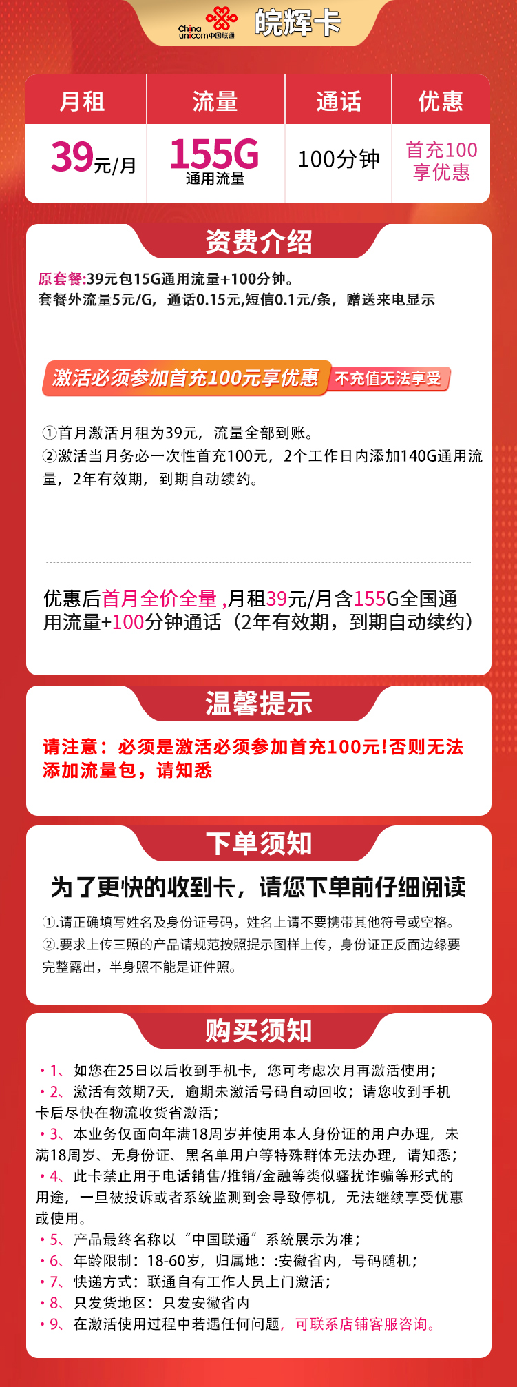②:激活当月务必一次性首充100元,2个工作日内添加140G通用流量,2年有效期,到期自动续约。综上所述:优惠后首月全价全量,次月起月租39元/月含155G全国通用流量+100分钟通话(2年有效期,到期自动续约)