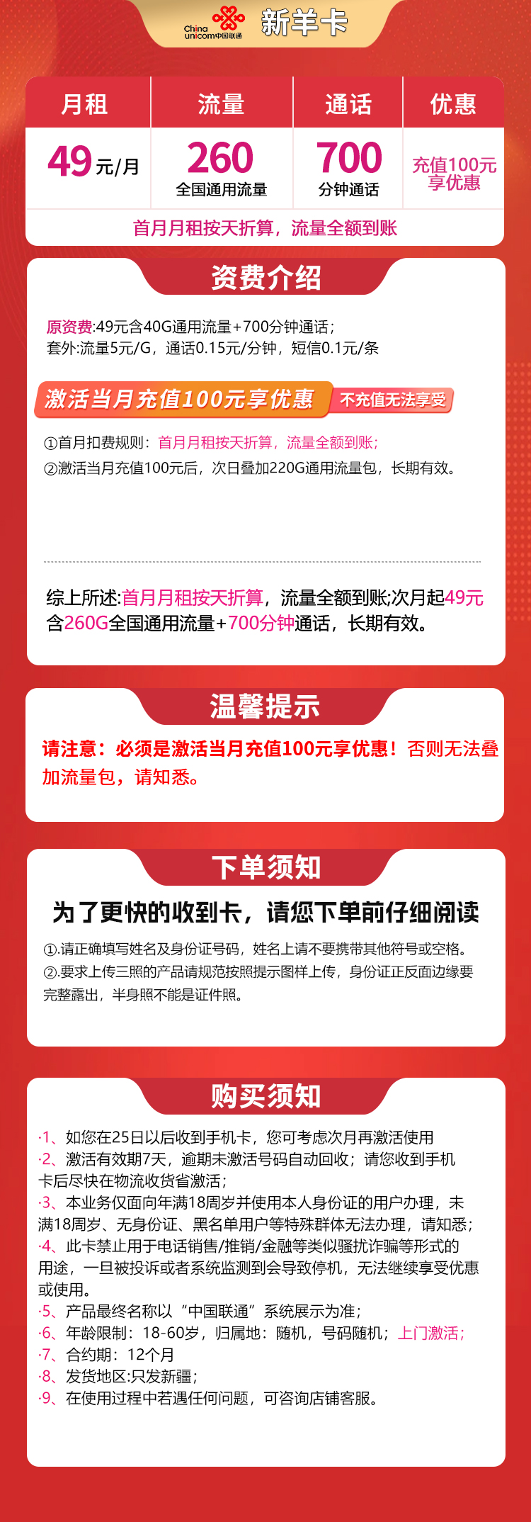 首月按天扣费,流量全给;激活后充100元送220G流量(长期有效)。次月起每月49元享260G+700分钟,长期套餐。