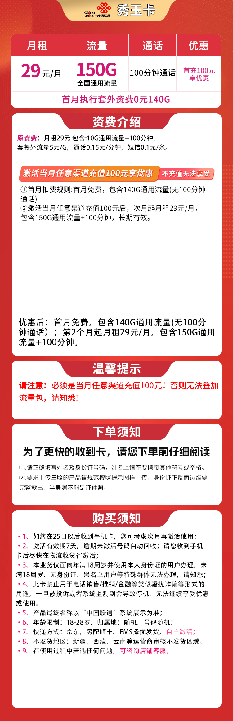 ①首月扣费规则:首月免费,包含140G通用流量(无100分钟通话)②激活当月任意渠道充值100元后,次月起月租29元/月包含150G通用流量+100分钟,长期有效。综上所述:首月免费,包含140G通用流量(无100分钟通话)第2个月起月租29元/月,包含150G通用流量+100分钟,长期有效