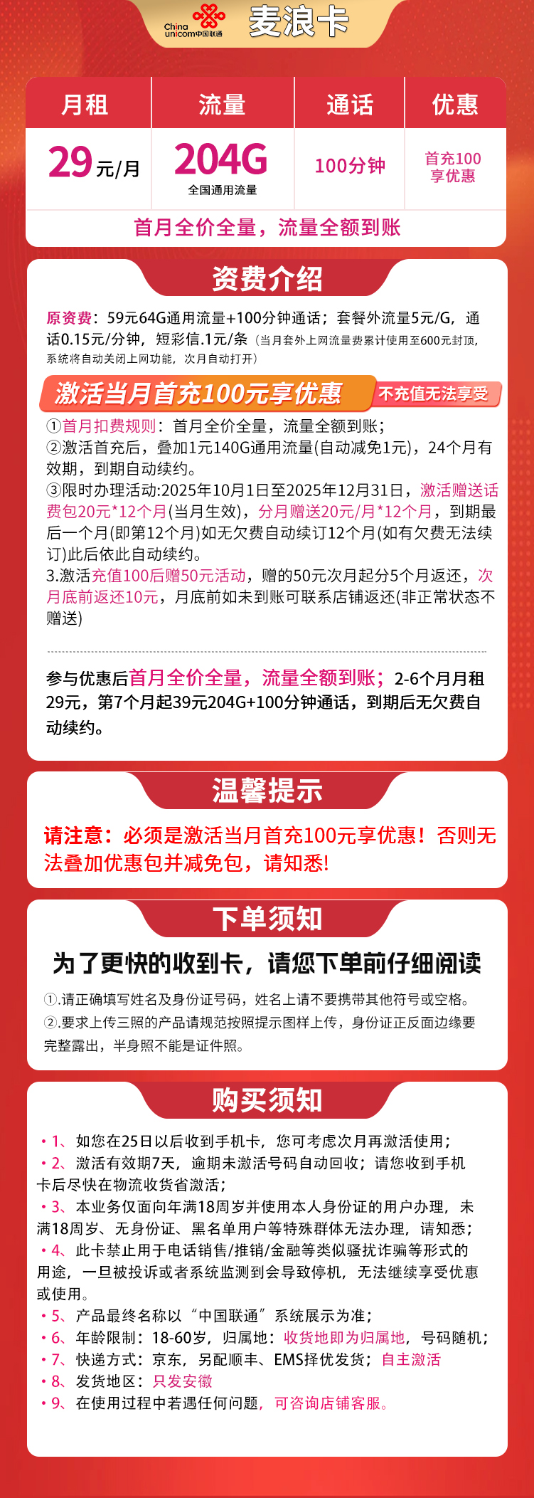 简单说:前6个月29元/月,之后39元/月,每月204G流量+100分钟通话,首充100才能享受优惠。
