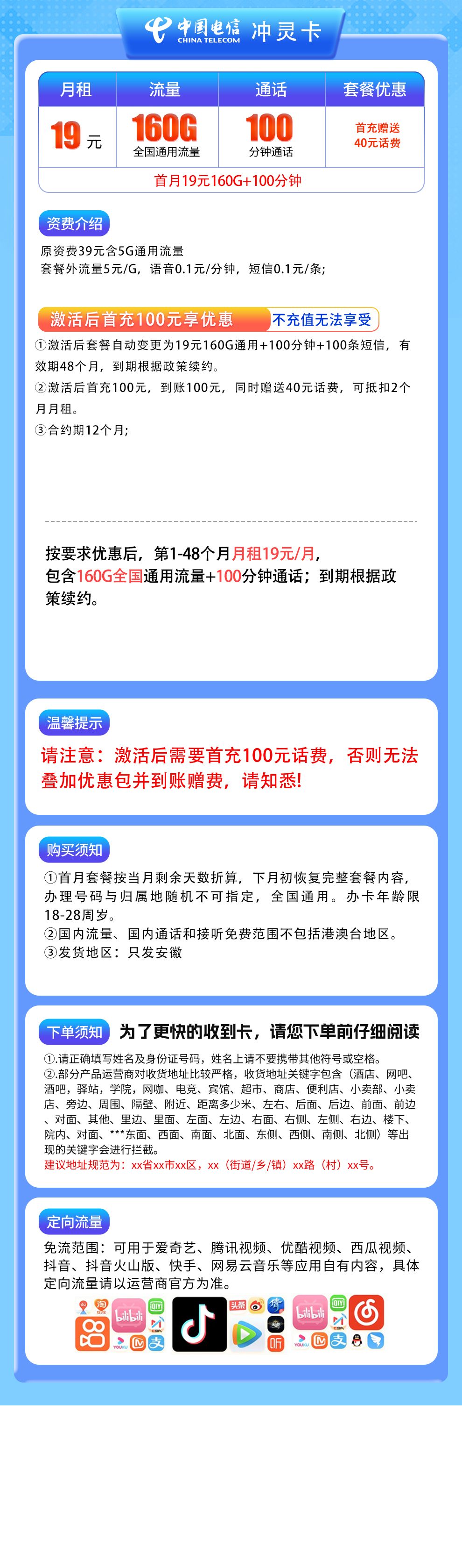 ①激活后套餐自动变更为19元160G通用+100分钟+100条短信,有效期48个月,到期根据政策续约。