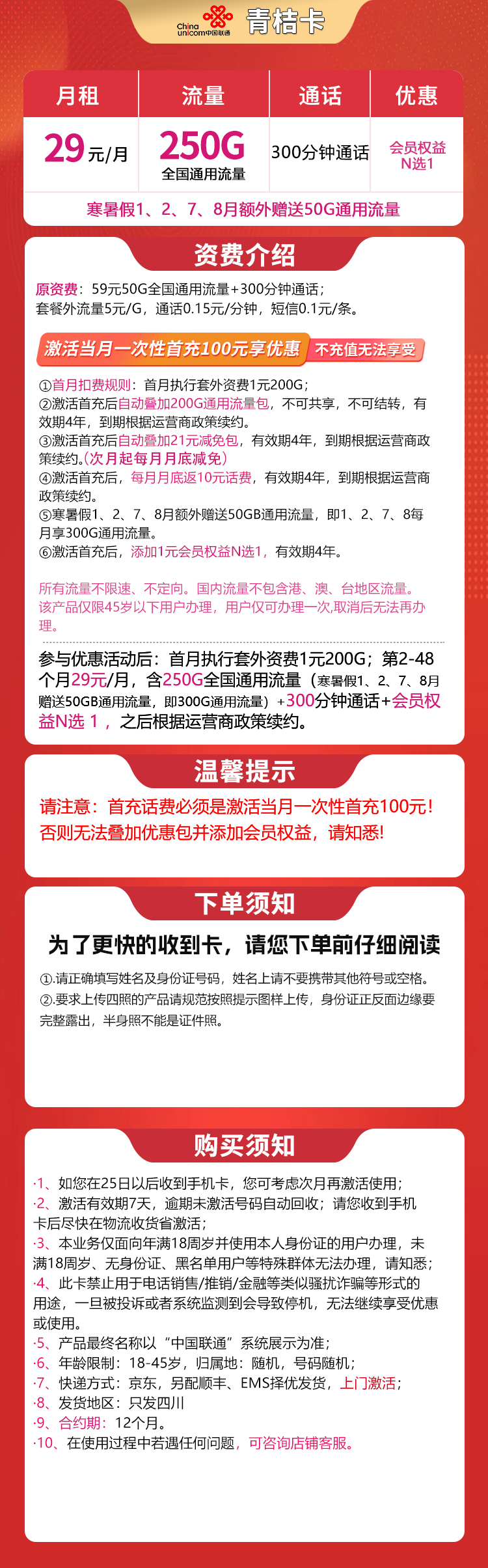 第2月-48月,29元/月,含250G全国通用流量(假1、2、7、8月赠送50GB通用流量,即300G通用流量)+300分钟通话+会员权益N选1