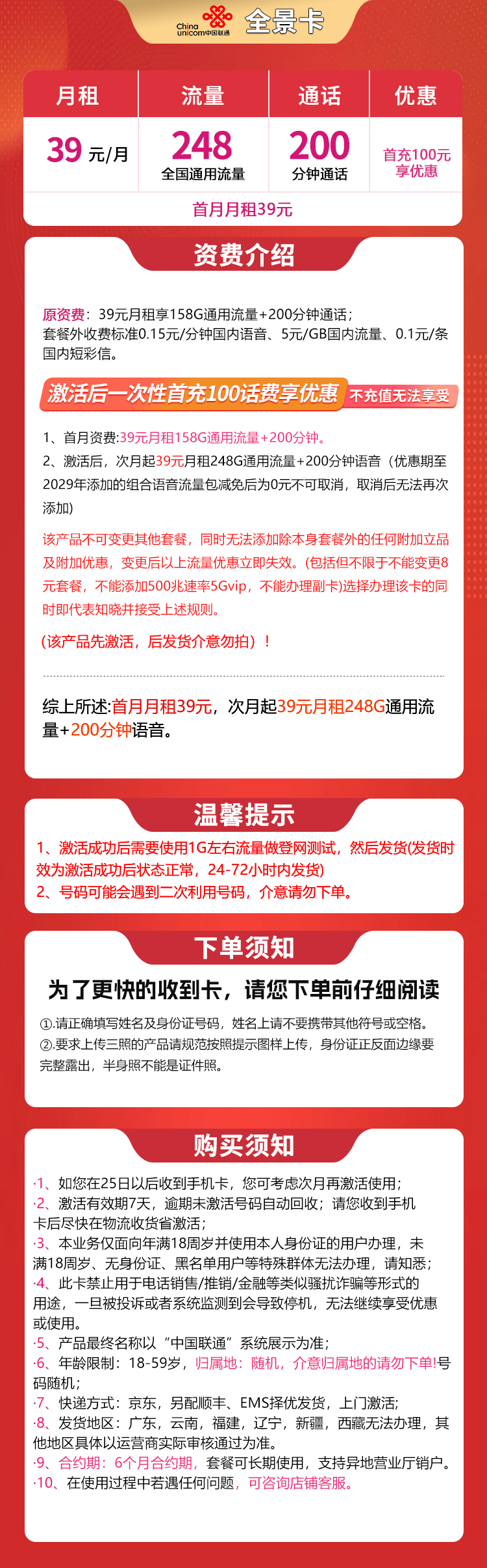 2、激活后,次月起39元月租248G通用流量+200分钟语音(优惠期至2029年添加的组合语音流量包减免后为0元不可取消,取消后无法再次添加)