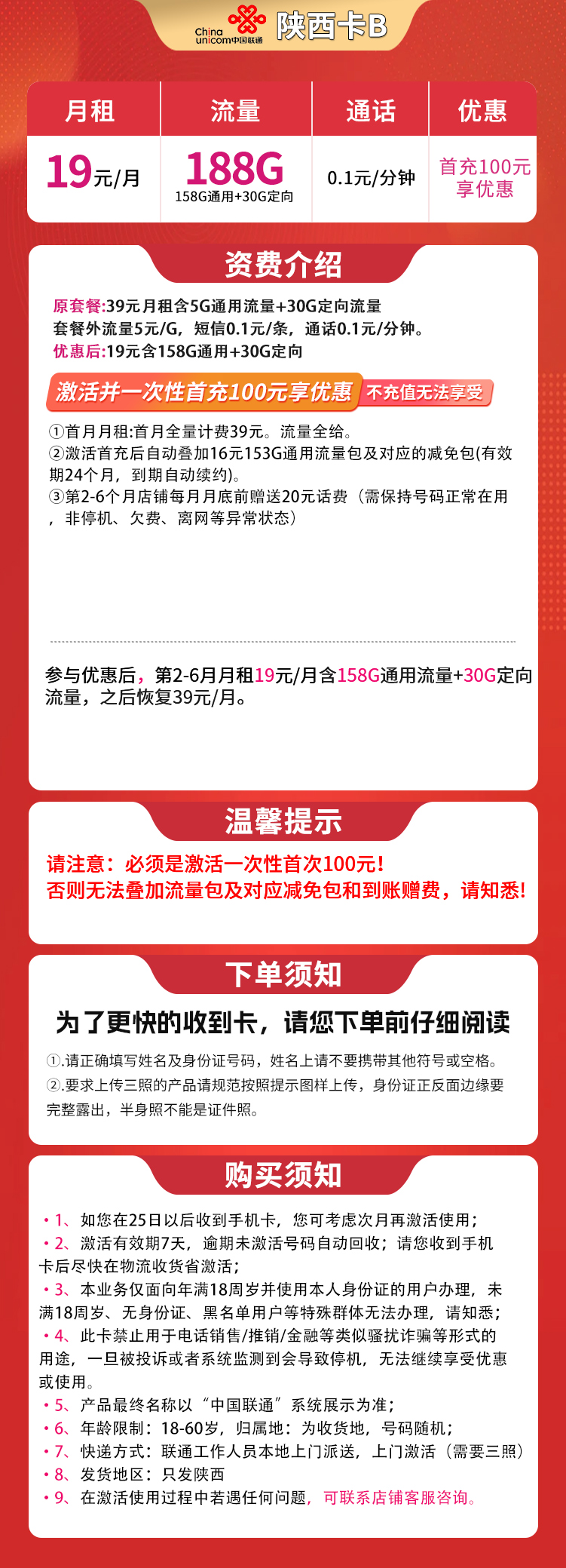激活并一次性首充100元,方可享受以下优惠:1全月全量2激活后24小时内叠加153G全国流量包,有效期24个月。到期自动续约3按要求激活首充后店铺补贴:第2-6个月每月补贴20元,月底到账,要求号码不欠费,不停机,不三无●综上实现:首月全月租39,第2-6个月19元=158G通用流量+30G定向流量。之后恢复39/月