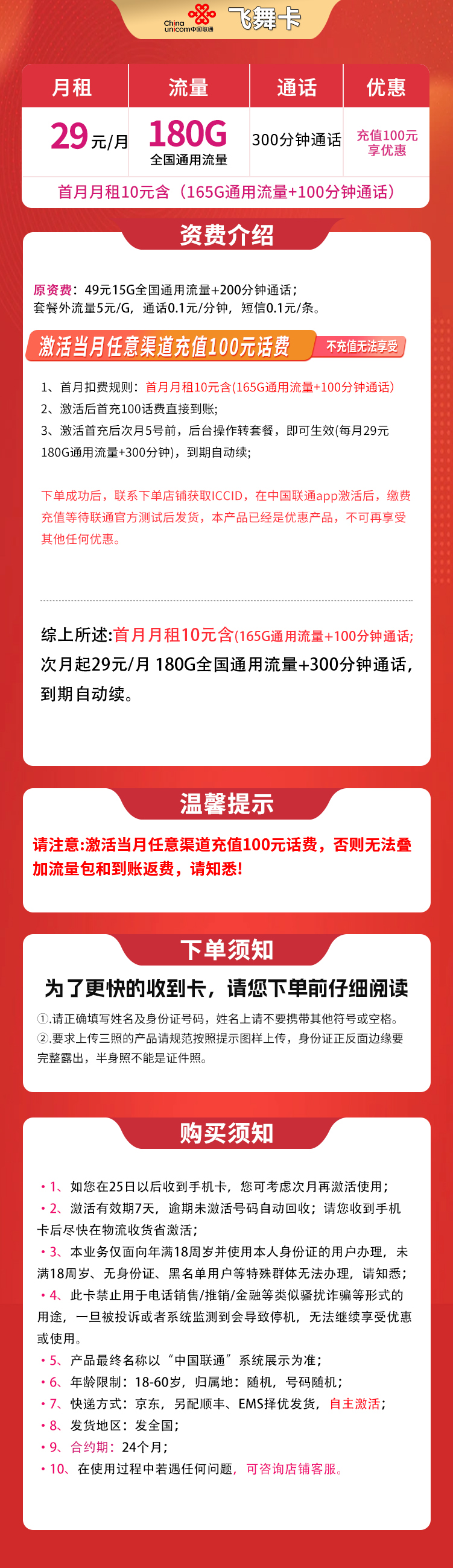 次月起29元/月180G全国通用流量+300分钟通话,到期自动续。