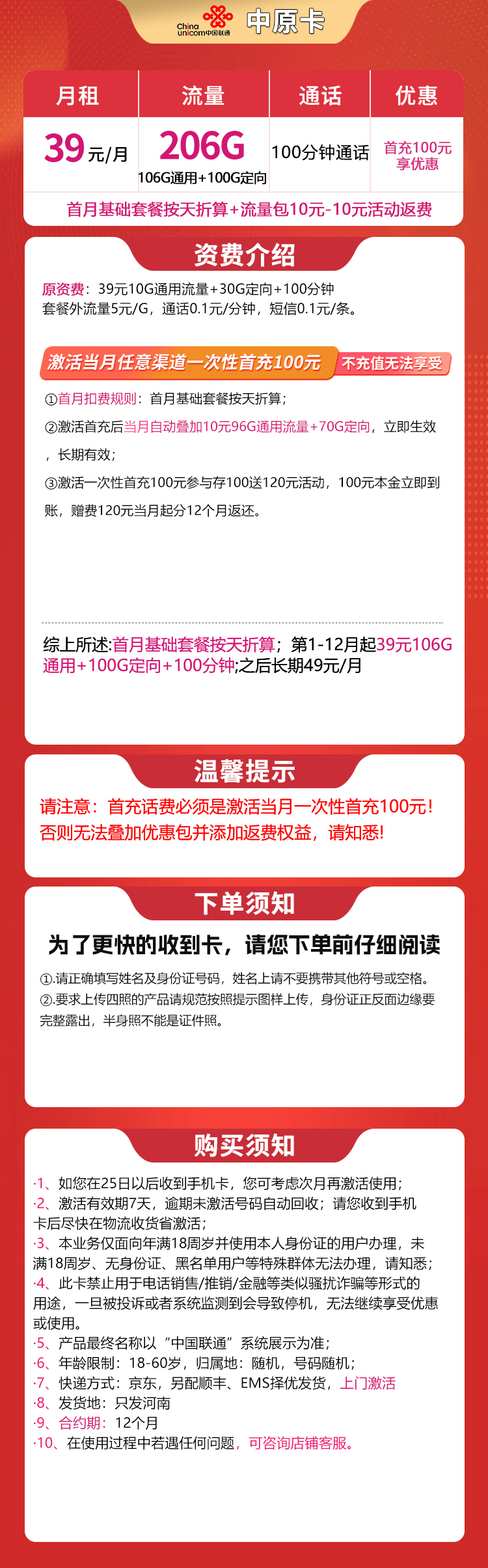 首月基础套餐按天折算,第1-12月起39元106G通用+100G定向+100分钟;之后长期49元/月