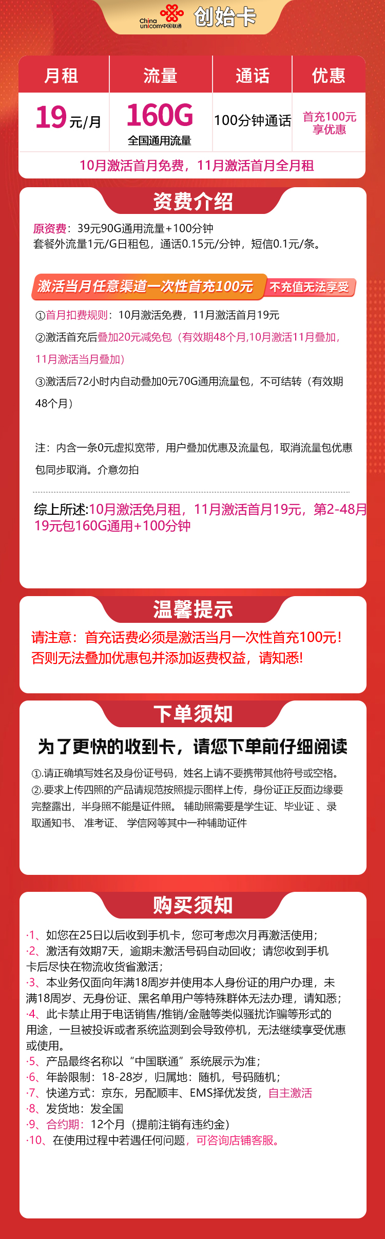 联通创始卡19元160G+100分钟【发全国】