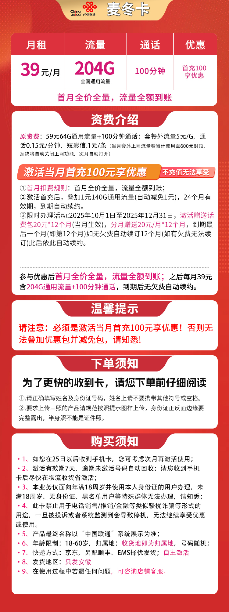 39元套餐:204G流量+100分钟通话(仅限安徽)