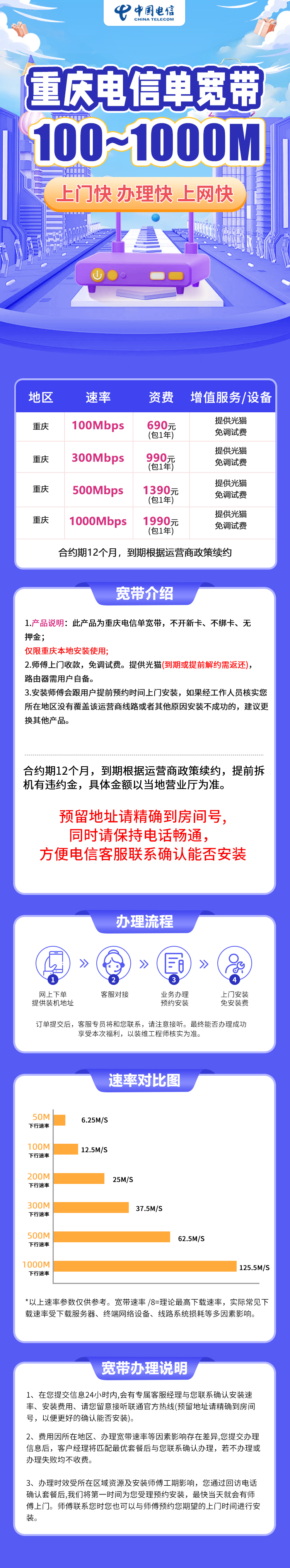 重庆电信690元包1年单宽带100M【免调试费】