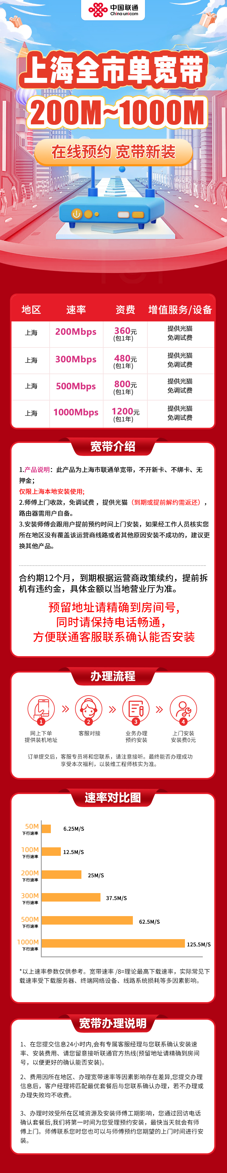 上海联通800元包1年单宽带500M【免调试费】