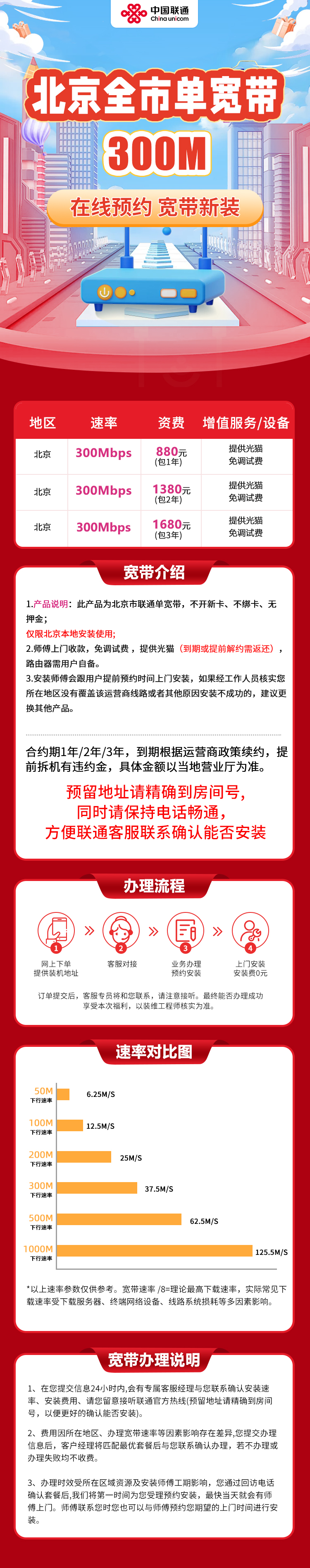 北京联通宽带套餐:880元包1年,300M宽带,免安装调试费。