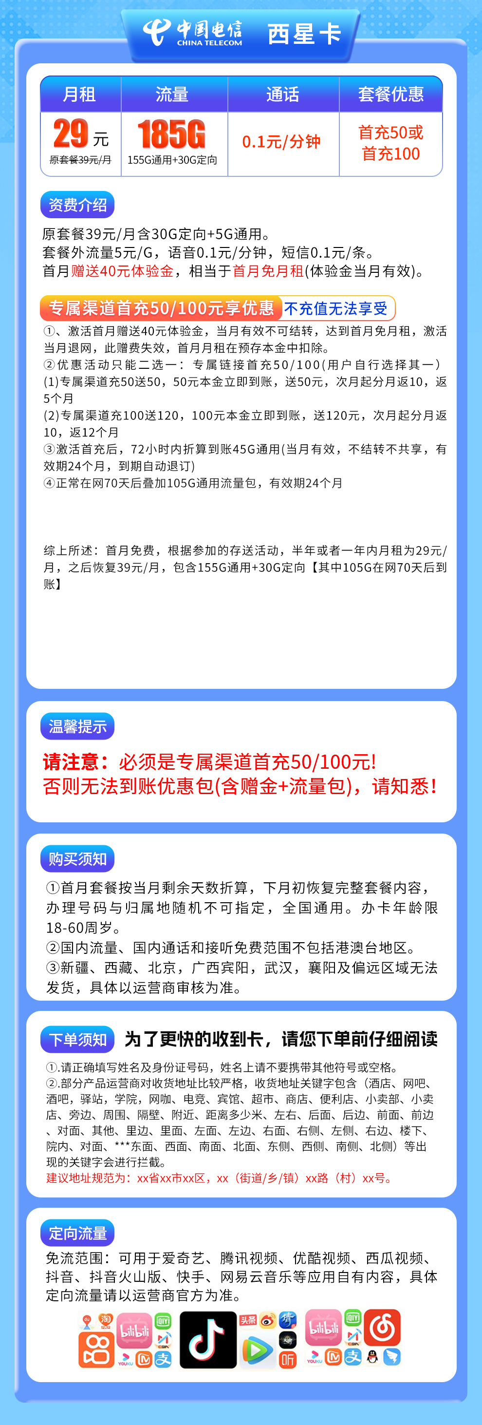 首月免租,根据参加的存送活动,半年或者一年内月租为29元/月,之后恢复39元/月,包含155G通用+30G定向(其中105G在网70天后到账,有效期24个月)
