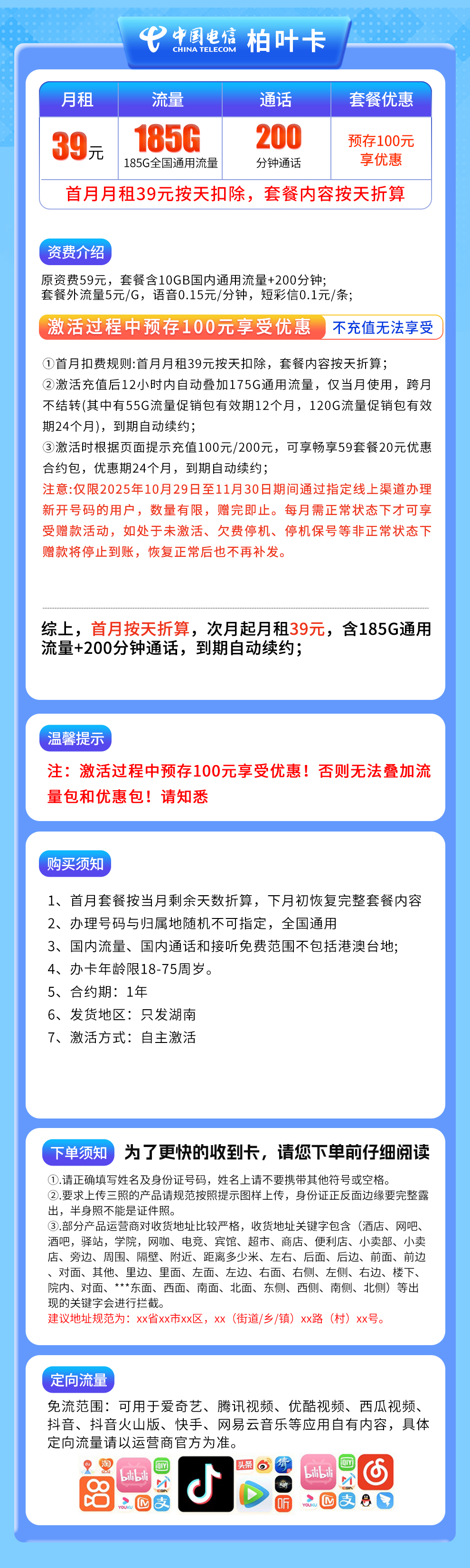 首月按天折算,次月起月租39元,含185G通用流量+200分钟通话,到期自动续约。