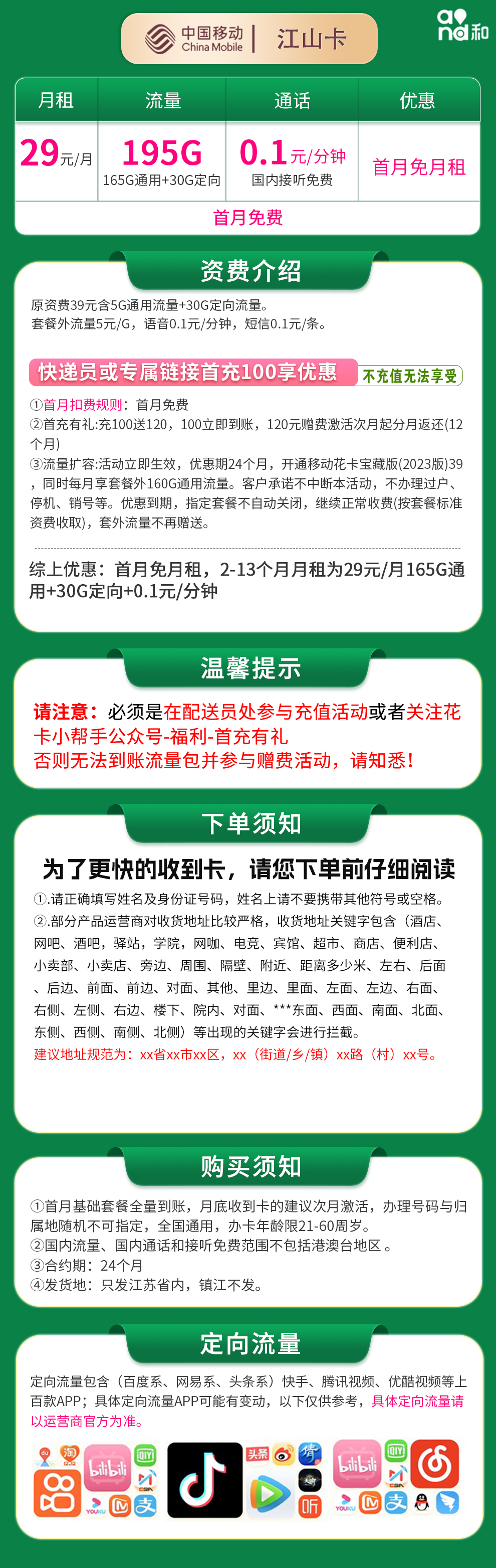 - 首月免费,第2-13个月29元/月,含165G通用+30G定向流量