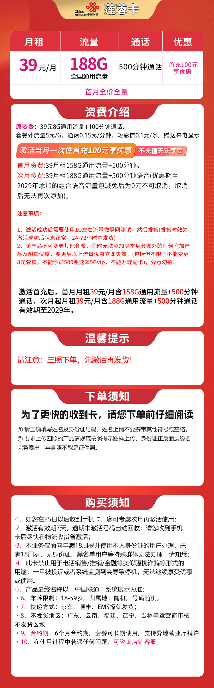 次月资费:39月租188G通用流量+500分钟语音(优惠期至2029年添加的组合语音流量包减免后为0元不可取消,取消后无法再次添加)。