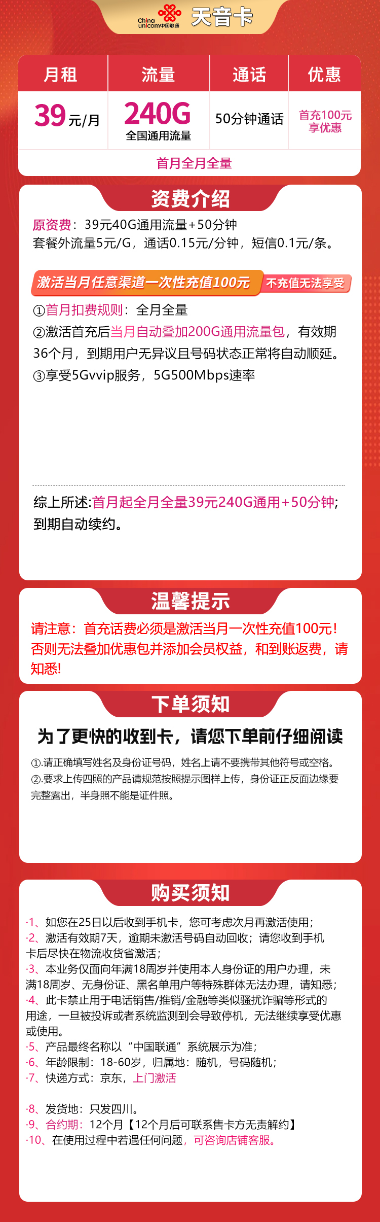【联通天因卡】39元月租,240G通用流量+50分钟通话,仅限四川省内使用。