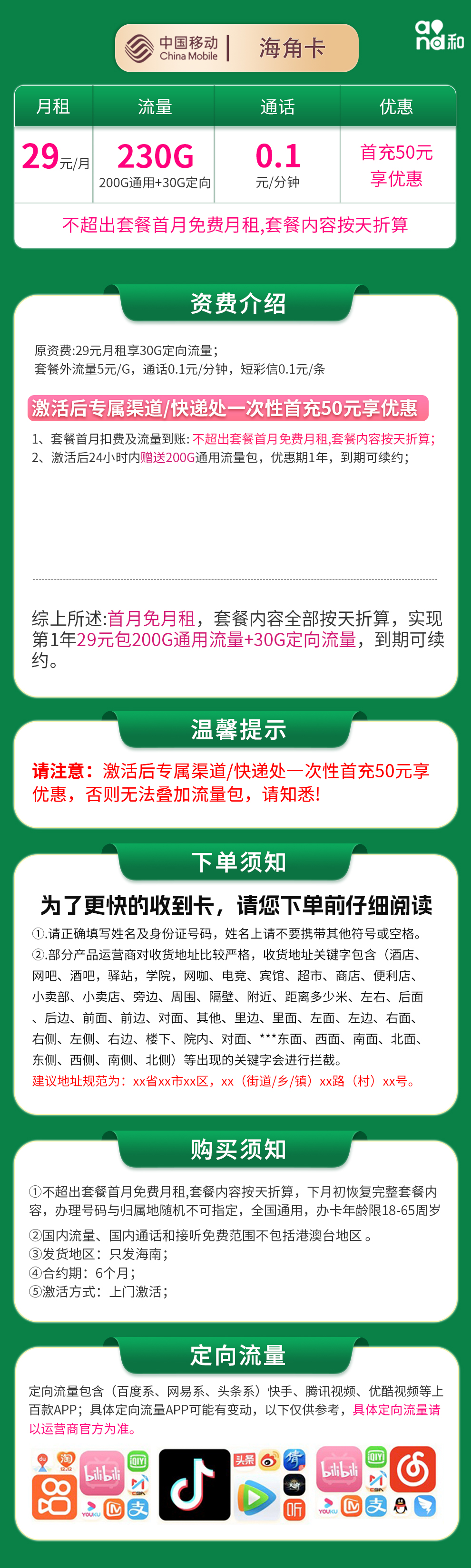 激活后专属渠道/快递处一次性首充50元享优惠(不充值无法享受)
