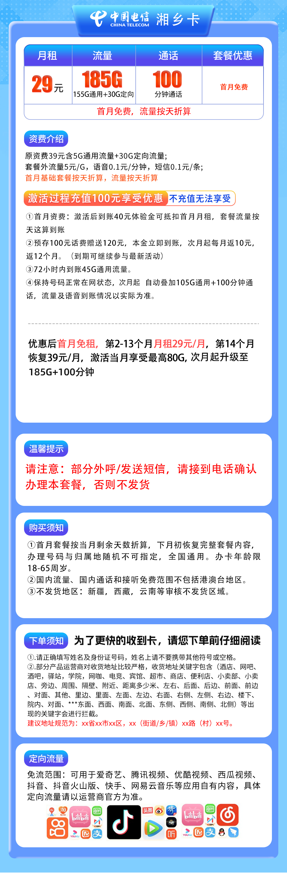 流量:首月最高80G,次月起185G通用流量(含45G年度包+105G长期包)