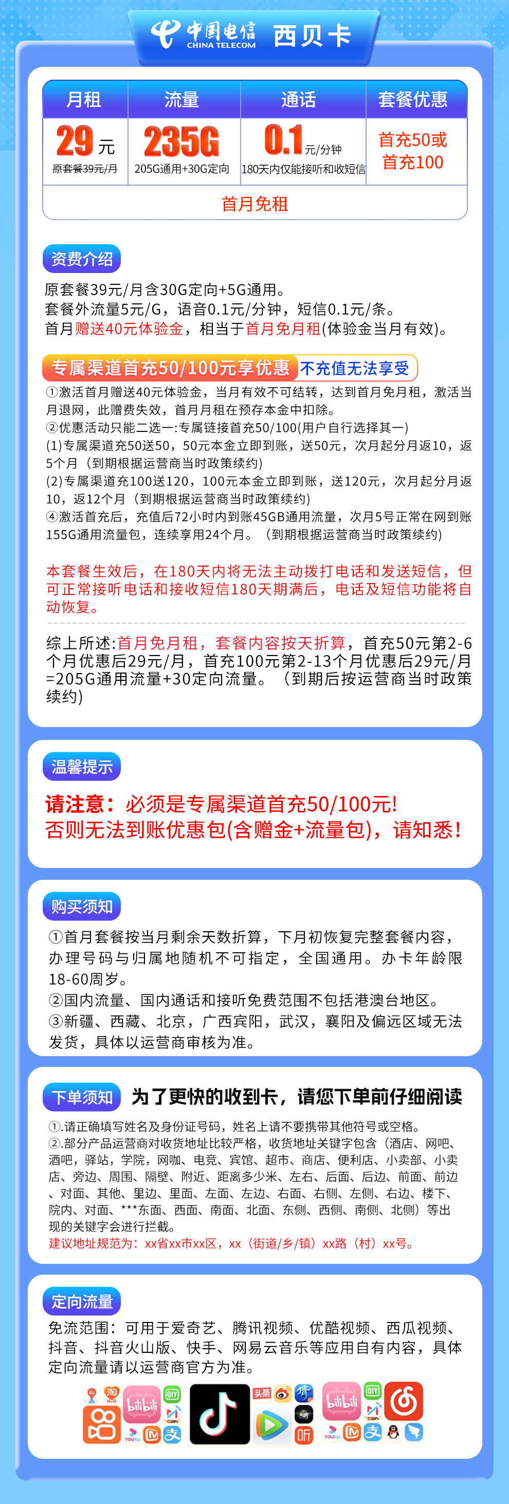 首充100元第2-13个月优惠后29元/月=205G通用流量+30定向流量。(到期后按运营商当时政策续约)