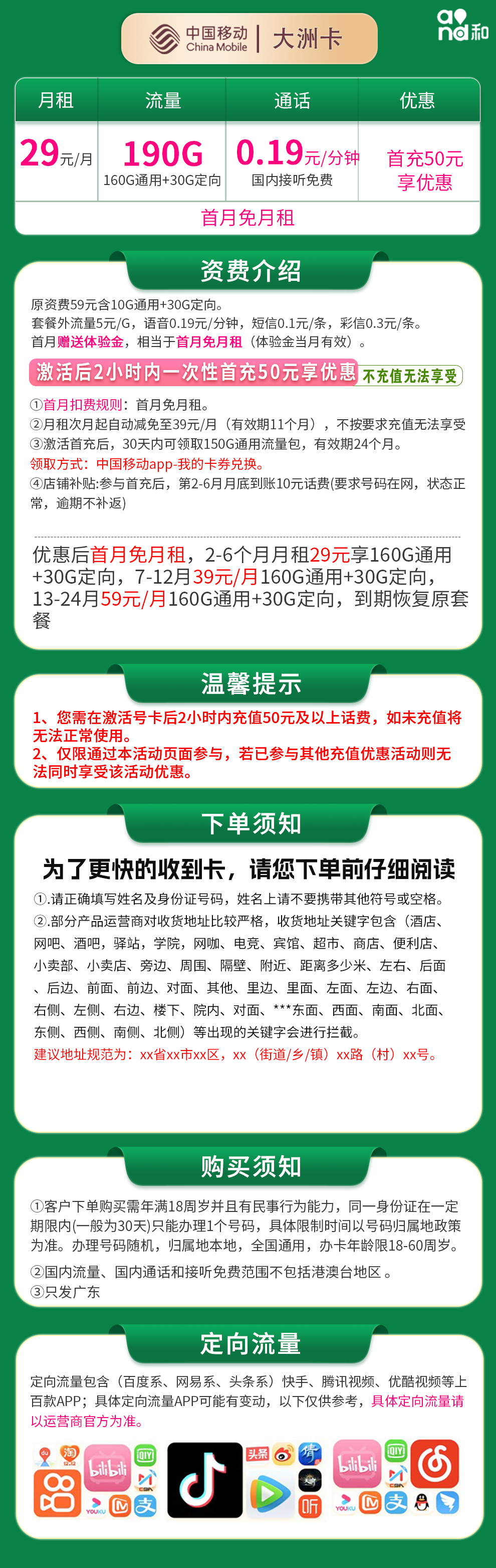 【移动大洲卡29元190G总结版】