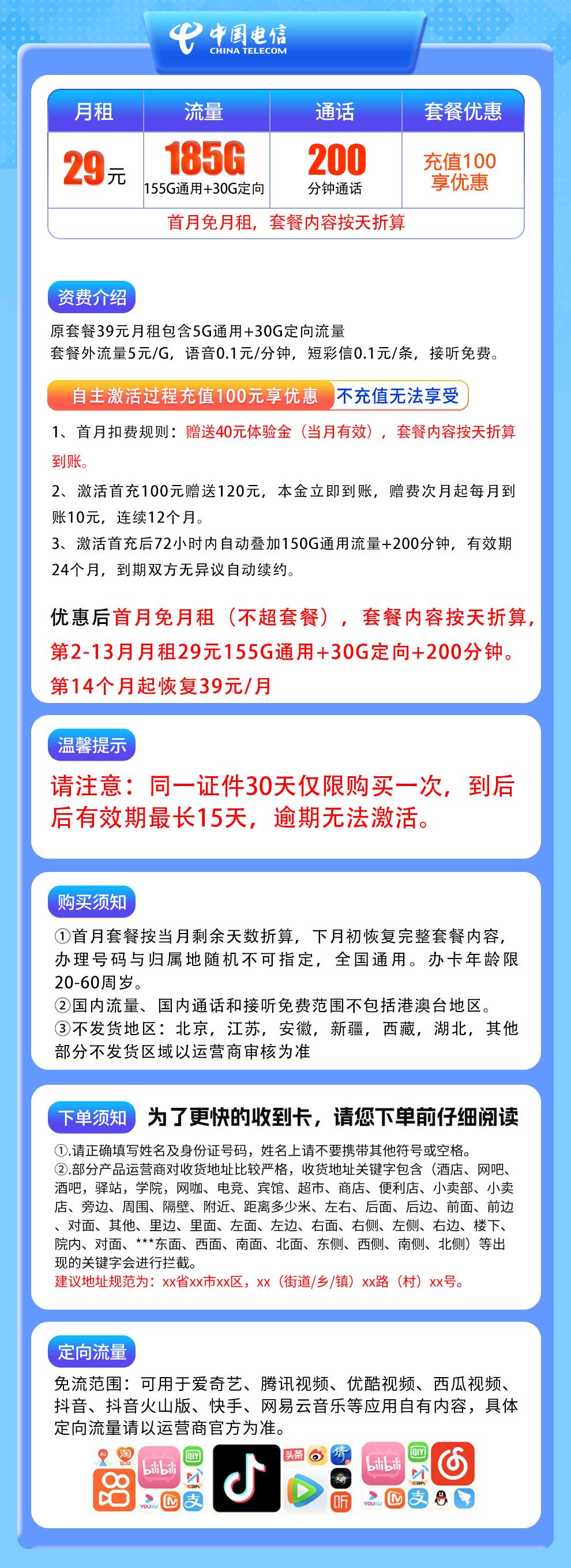 第2-13月月租29元155G通用+30G定向+200分钟:第14个月起恢复39元/月