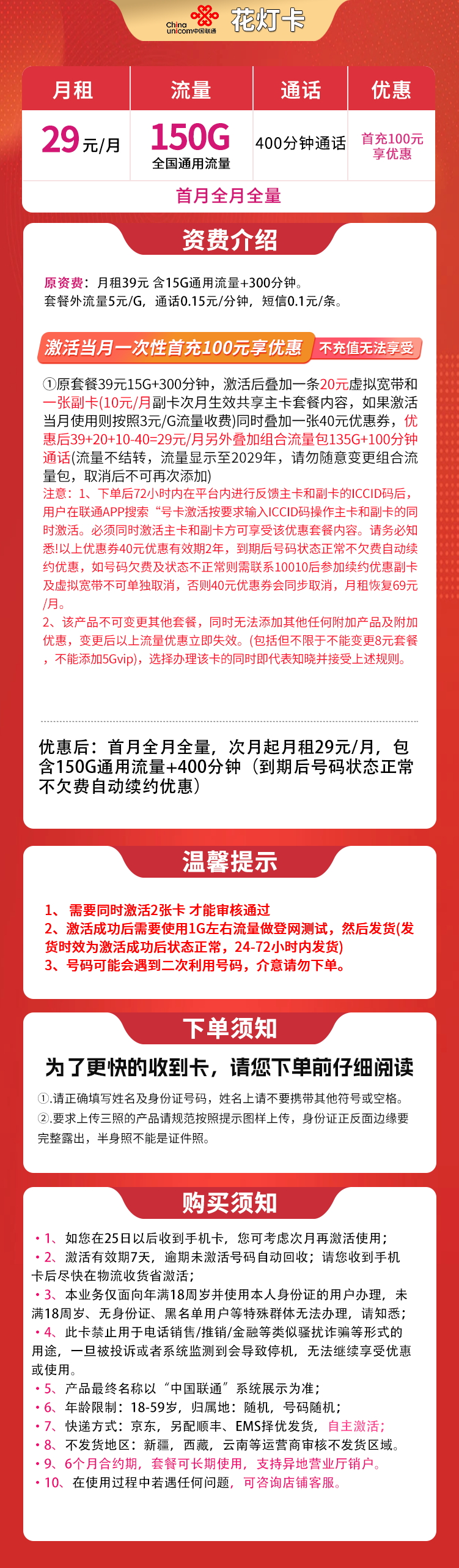 次月起月租29元/月,包含150G通用流量+400分钟(到期后号码状态正常不欠费自动续约优惠)