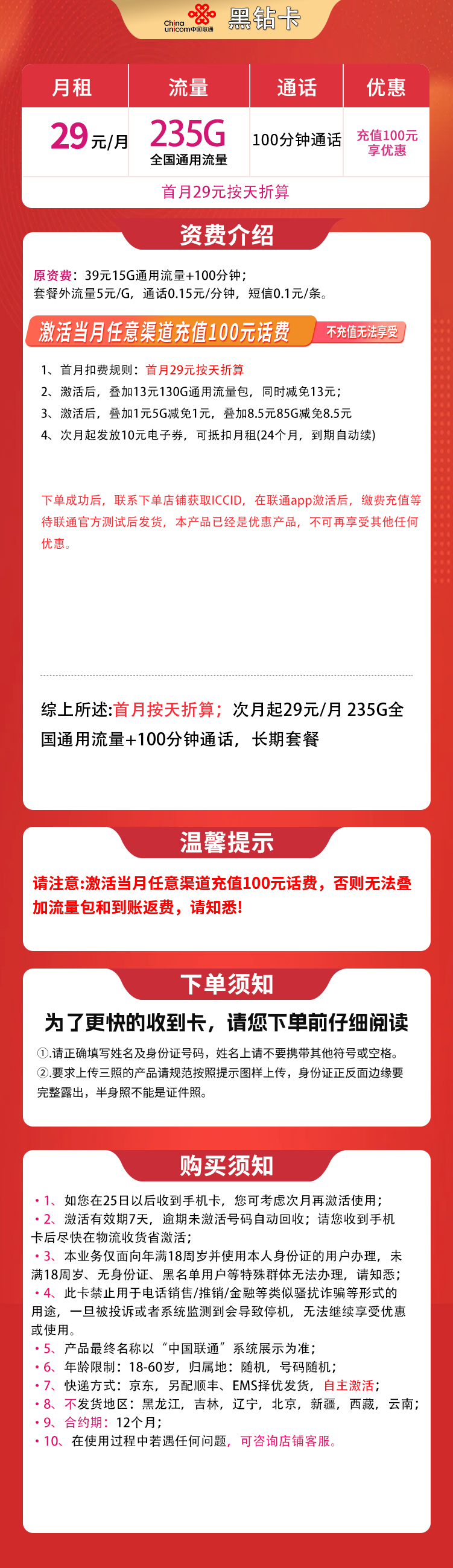 下单成功后,联系下单店铺获取ICCID,在联通app激活后,缴费充值等待联通官方测试后发货,本产品已经是优惠产品,不可再享受其他任何优惠。
