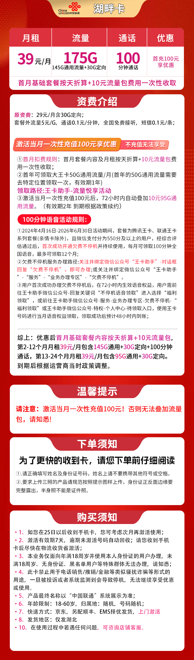 ③激活当月一次性充值100元后,72小时内自动叠加10元95G通用流量。(有效期2年 到期根据当时政策续约)