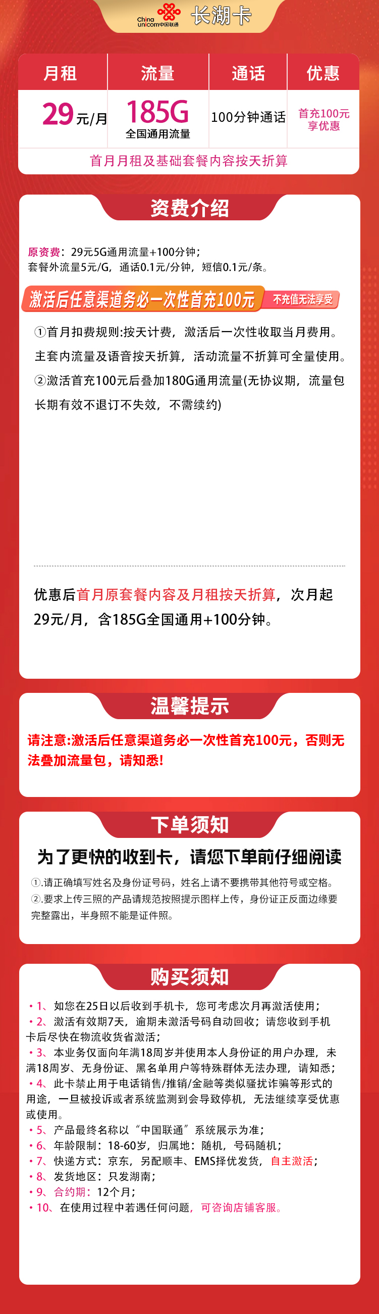次月起每月29元,包含185G全国通用流量+100分钟通话