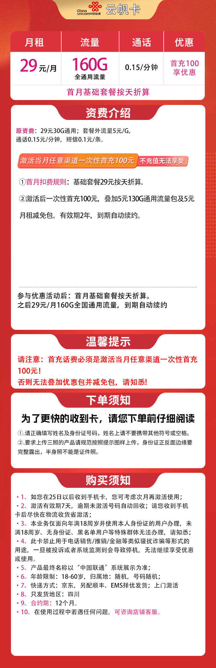②激活后一次性首充100元后,叠加5元130G通用流量包及5元月租减免包。有效期2年,到期自动续约。