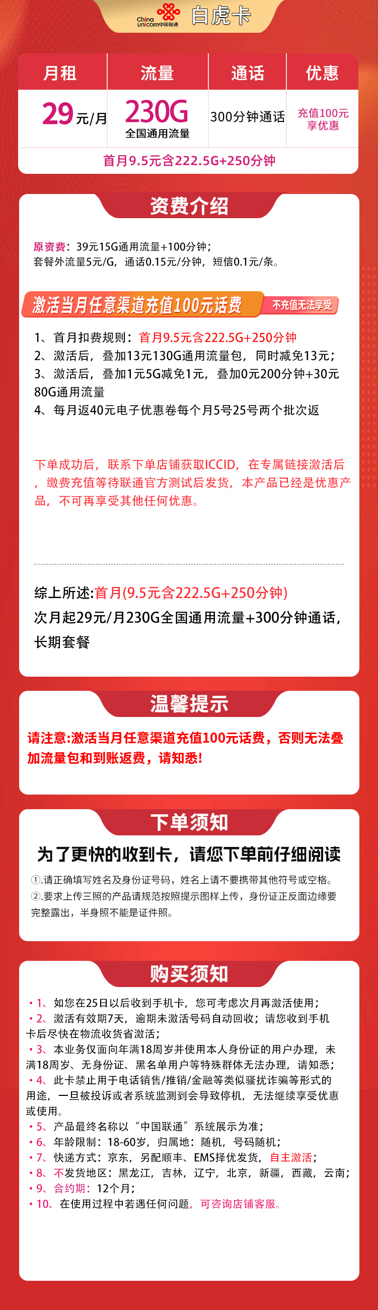 首月(9.5元含222.5G+250分钟) 次月起29元/月230G全国通用流量+300分钟通话,