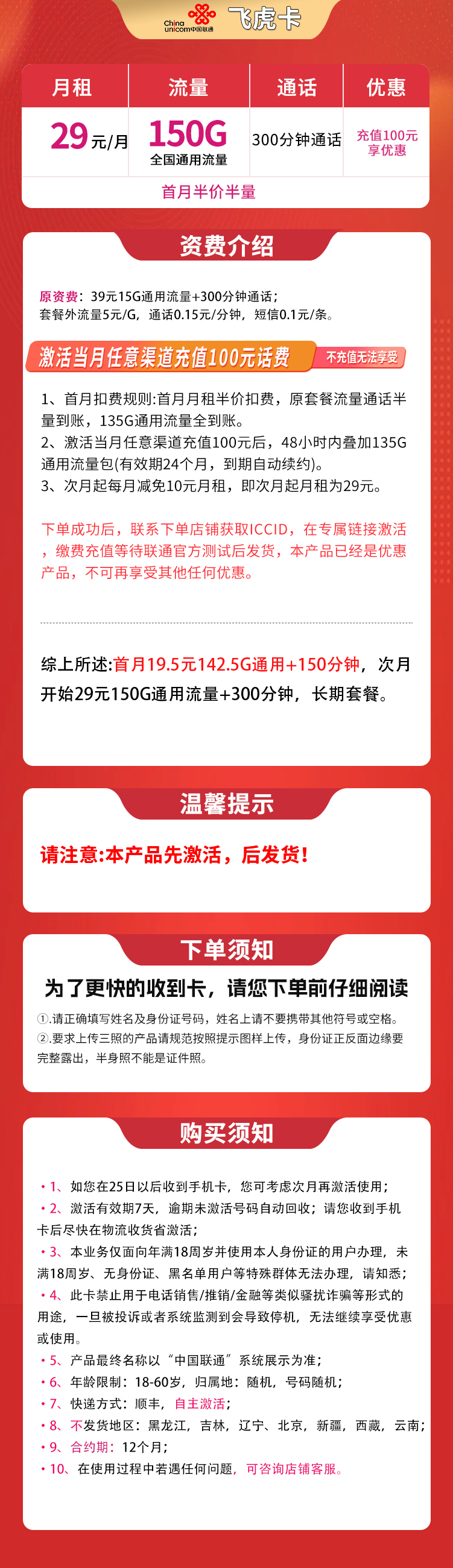 下单成功后,联系下单店铺获取ICCID,在专属链接激活缴费充值等待联通官方测试后发货,本产品已经是优惠产品,不可再享受其他任何优惠,