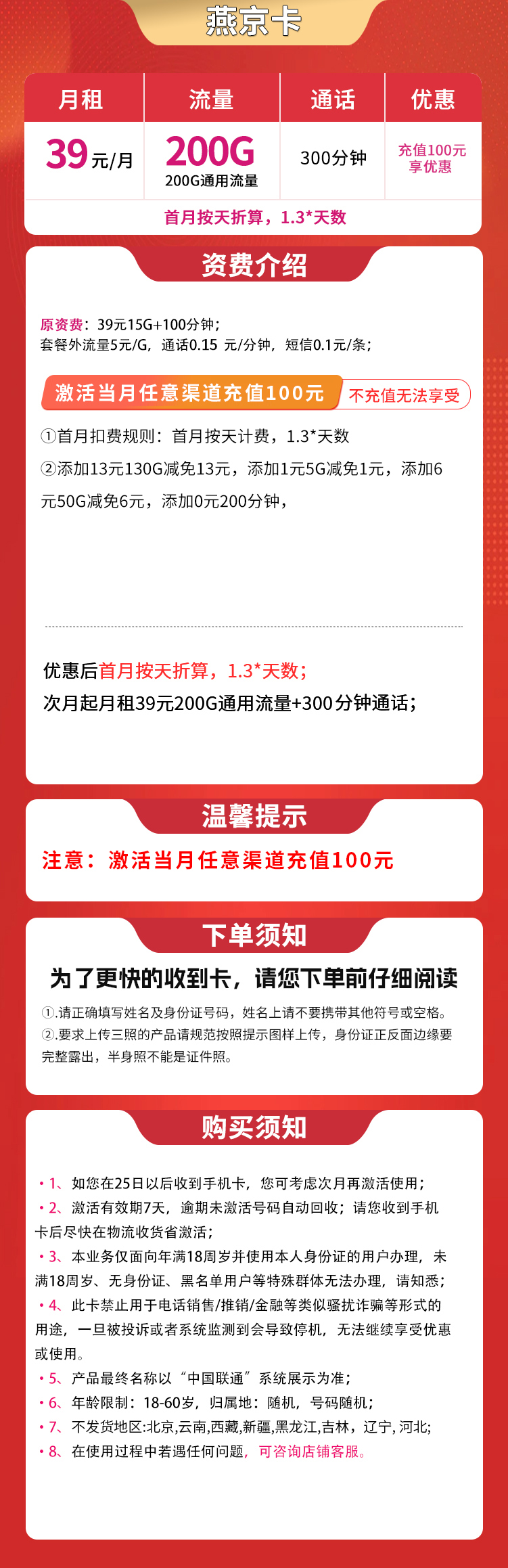 简单说:充100元激活,之后每月39元,用200G流量和300分钟通话。