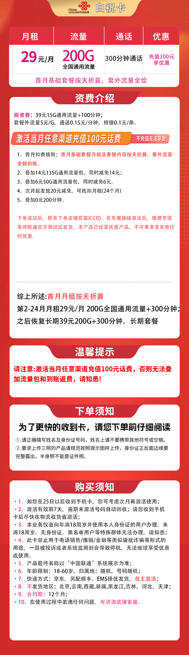 联通白祝卡:29元月租,含200G全国通用流量和300分钟通话,适合高流量需求用户。