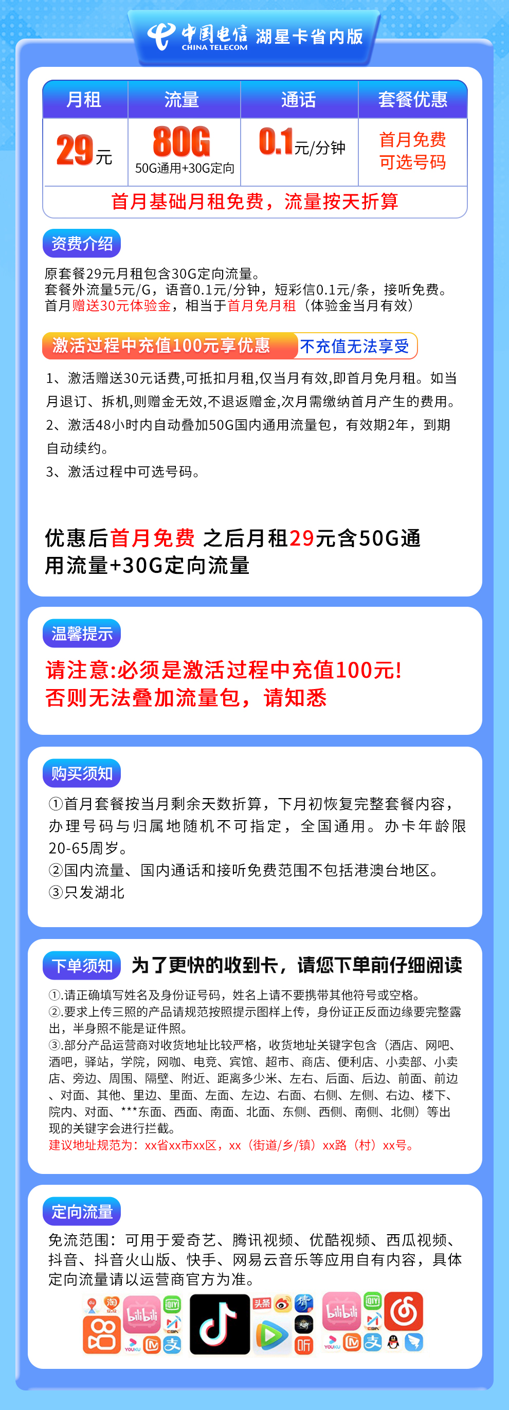 综上所述:首月免租,后长期29元/月50G通用+30G定向